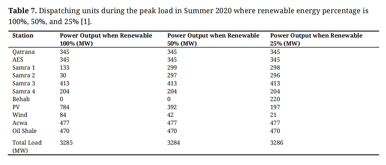 Table 7. Dispatching units during the peak load in Summer 2020 where renewable energy percentage is 100%, 50%, and 25% [1].