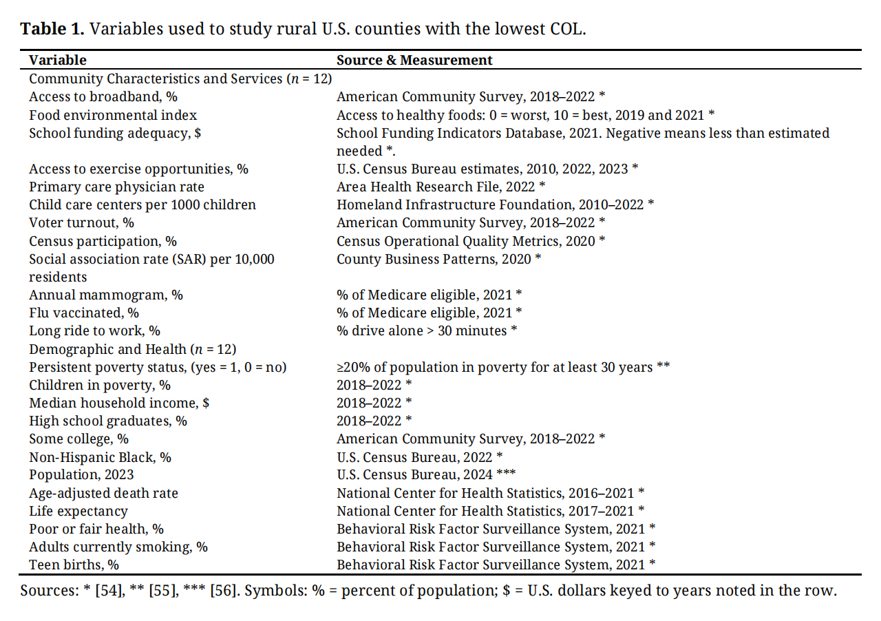 The contribution of this paper is to offer a realistic view of rural areas in the United States with the lowest COL. It contributes to the literature on housing costs, local cooperation, and gentrification in low-income areas, highlighting the diverse range of rural areas encompassed by the definitions of rural places. It should also provide food for thought for those to list what they expect if and when they move to a rural area. Relocation to a lower COL area may work in the short run to provide greater economic sustainability. However, in the long term, such a move may be inconsistent with a broader set of considerations essential for a sustainable existence for both new and current residents.