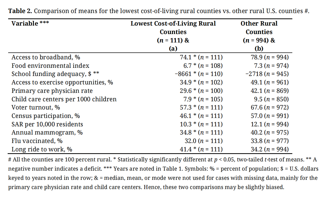 Q2. How Do the Lowest-COL Rural Areas Compare to Other Rural Areas for Services and Community Assets?Table 2 compares the lowest-COL rural counties (n = 111) with approximately ten times as many other rural counties (n = 994) across the twelve dimensions of community characteristics and services. The results are not subtle. Across all 12 variables, the outcomes for the lowest COL counties are less favorable than for the other rural counties, with 11 of the 12 being statistically significant at p < 0.05. (Flu vaccination is the exception.).