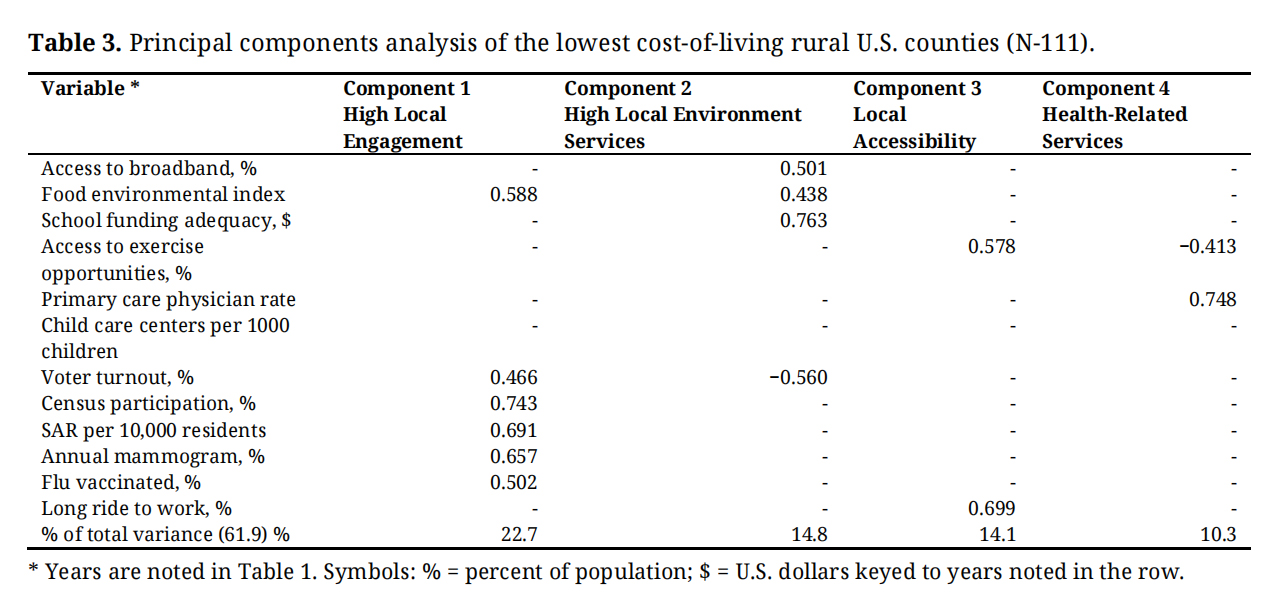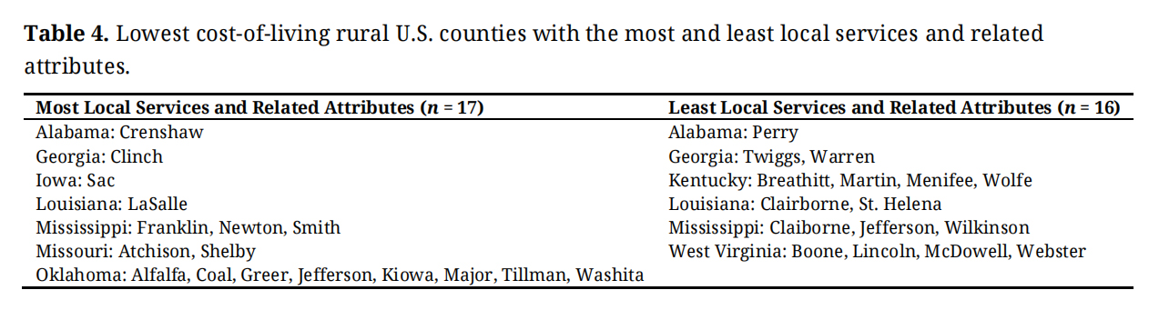 Regarding local policy formation, we recognize the bind of economic decline that many rural areas, especially those in this study, face. Individuals interested in relocating to a low-cost rural area should be diligent about their objectives and tolerances for reduced services. In some cases, the gap between urban-suburban and 100 percent rural areas in the United States is pronounced. Local politics must be considered in investigations before a move, as the existing local community may not welcome migrants, viewing them as instruments of change. There may be friction with long-term residents about the local environment and embedded culture. Migrants to these areas need to be prepared to collaborate effectively with local groups to enhance the quality of life in rural communities and increase their chances of a successful transition. Before moving, they must list and discuss their goals to achieve a sustainable environment, use publicly available data, and review local community plans and media information to increase their knowledge. If they take these steps, they may avoid becoming among those who move to a lower COL area that they assumed would be a marked improvement, only to be disappointed and try to return to the place they left.