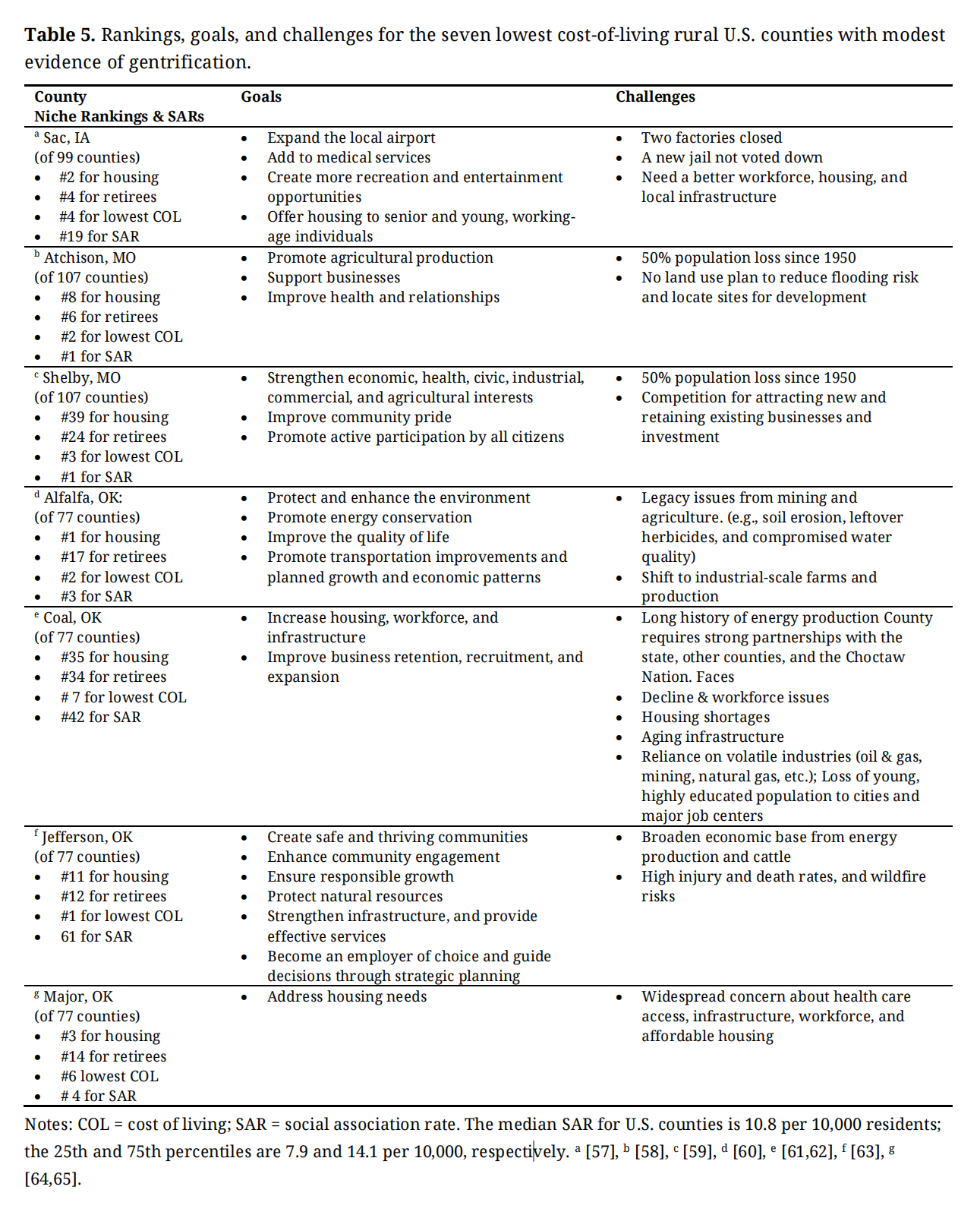 The final piece of our Q3 analysis was to ground-truth the quantitative data analysis on seven counties with short case studies of counties for evidence that met Nelson’s criteria [41] of having a disproportionately high number of seniors (65+) and Hispanic Americans, as well as evidence of local cooperation within communities. These seven were chosen from the 17 counties in the most service group of counties. Sac, IO; Atchison and Shelby, MO; Alfalfa, Coal, Jefferson, and Major, OK, have higher proportions of both senior residents (65+) and Hispanic Americans, markers of gentrification, as per Nelson et al. The differences between these seven and the other 10 high-service counties, however, were slight. The medians were almost the same. We do not consider these limited case studies sufficient for generalization. They are diverse in many ways, as stated below, but do represent the possibility of a case study approach that could lead to policy-significant insights about why some low COL places can provide more services than many others with low COLs.