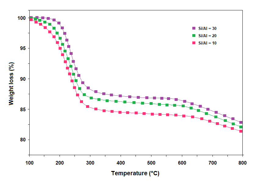 Figure 6 presents the TGA profiles of mordenite samples synthesized with different SAR values (10, 20, and 30) over the temperature range of 100–800 °C, illustrating how variations in framework composition and textural development influence the retention and release of volatile species. Two principal mass-loss events are observed for all samples.