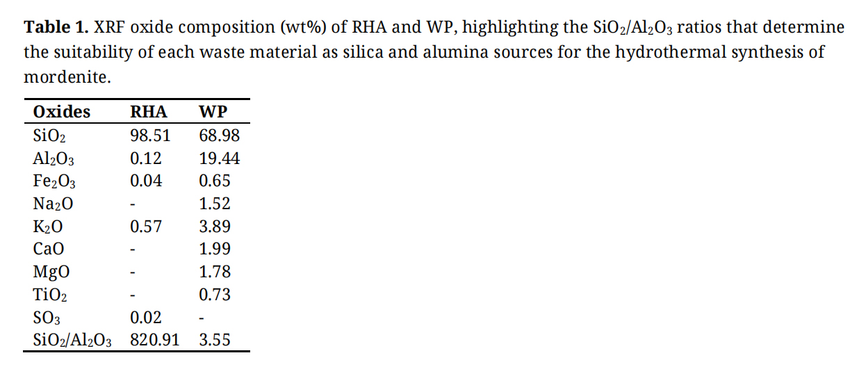 In this work, RHA was employed as an alternative silica source and WP as the aluminum source for MOR synthesis. This approach is consistent with the principles of green chemistry and the circular economy, as it enables the conversion of agricultural and industrial residues into high-value functional materials while promoting environmentally responsible and economically viable production chains.