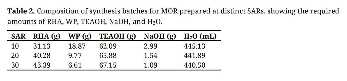 Table 1 presents the XRF results for the raw materials (RHA and WP) employed in the synthesis of the molecular sieves. To obtain SAR values of 10, 20, and 30, t he proportions of RHA and WP were calculated based on their respective SiO2 and Al2O3 contents, ensuring the appropriate silica-to-alumina balance required for each targeted composition.