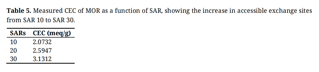 The second mass-loss region, extending from 400 to 800 °C, is attributed to the dehydroxylation of structural Si–OH and Al–OH groups, as well as to the release of species bound to acid sites, particularly Brønsted sites. The slightly higher mass loss observed for the high-SAR samples indicates that, despite their lower total aluminum content, these materials retain a detectable fraction of thermally labile surface functionalities. This behavior is most likely associated with hydroxyl species formed during crystallization and incorporated within highly accessible microporous domains, which are more effectively revealed in samples exhibiting higher structural order and reduced impurity content. Overall, the TGA results confirm that all MOR samples display excellent thermal stability up to 800 °C, with the subtle differences in mass-loss profiles reflecting variations in textural accessibility rather than fundamental changes in framework stability. This behavior contrasts with classical zeolite chemistry but is consistent with the improved crystallinity and pore accessibility revealed by the textural analyses. Taken together, these results indicate that the CEC values reported here represent the fraction of ion-exchange sites that are structurally accessible in aqueous media, rather than the nominal framework charge alone. In low-SAR samples, a portion of the negative charge is likely associated with poorly porous or non-zeolitic alumina-containing phases, whereas in high-SAR mordenite a larger fraction of Al is incorporated into well-connected microporous domains. This explains why the operational CEC increases with SAR (Table 5) despite the overall decrease in aluminum content.