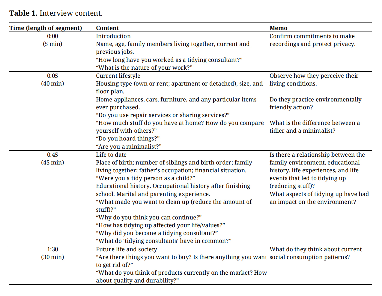 Specifically, this study sought to answer the following three questions: (1) What made people tidy up? (2) Why are some people able to keep things tidy? (3) How does tidying up transform people’s values about things and consumption patterns? The objective of this study was to explore how tidying influences consumption patterns.