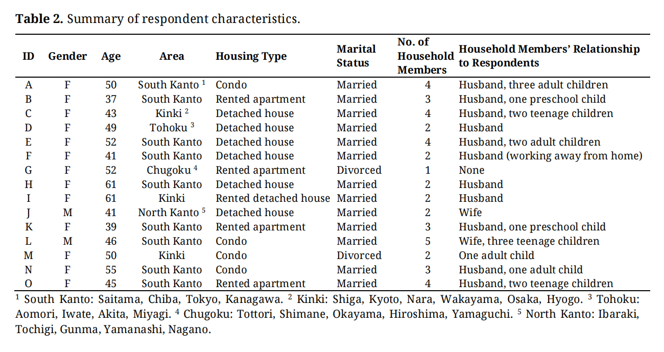 The respondents were predominantly middle-aged women in Japan who became professional tidying consultants after experiences as full-time homemakers (Table 2). Most lived in owner-occupied housing and identified as middle-class, reflecting their relatively stable living conditions. Two male respondents also became consultants, either as a side occupation or following a job loss.