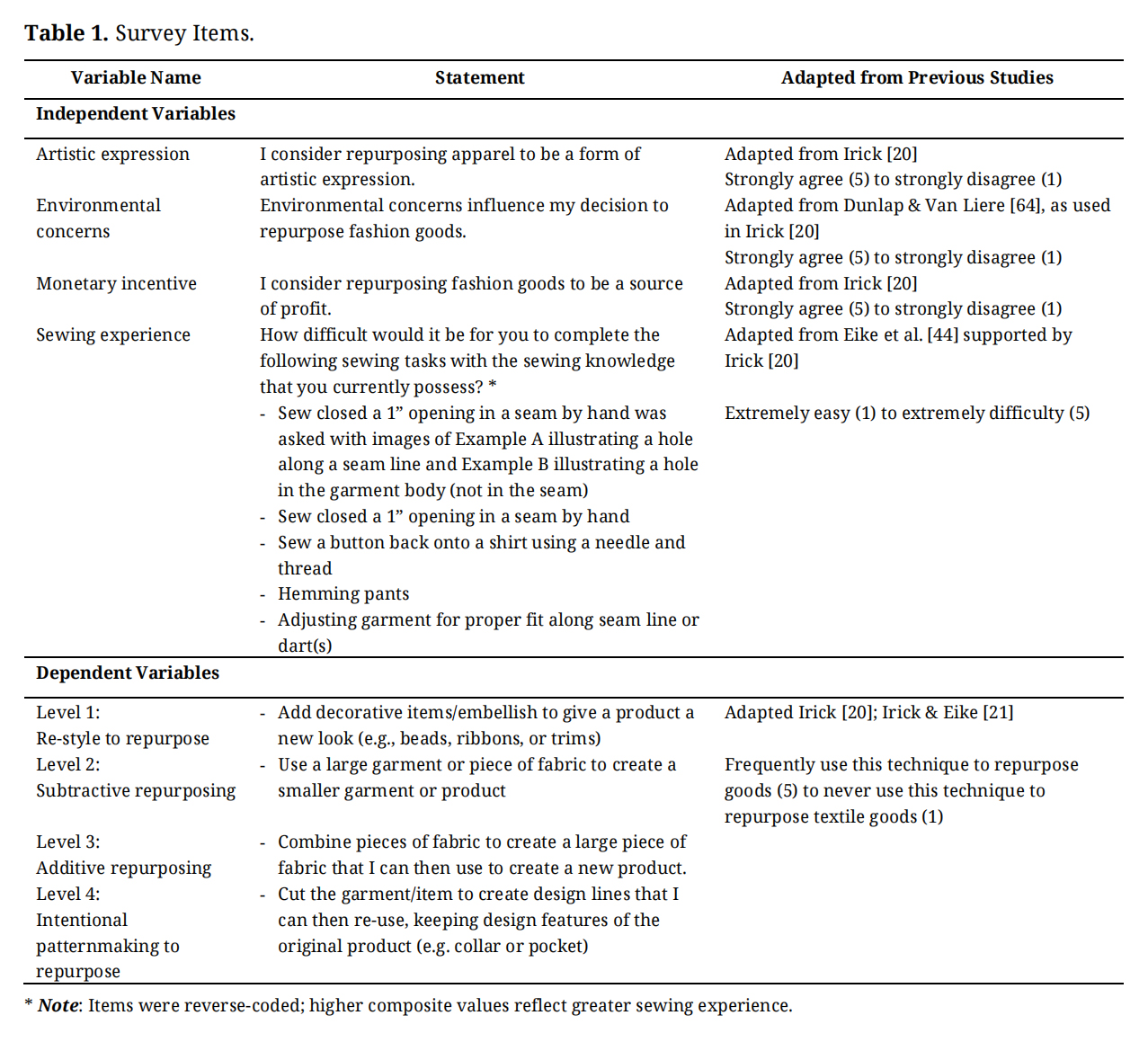 The questionnaire consisted of four sections: (a) demographics, (b) apparel consumption habits, (c) repurposing behaviors, and (d) sewing experience background. Artistic expression, environmental concerns, and monetary incentives were each measured using multiple statements rated on a five-point Likert scale, ranging from strongly agree (5) to strongly disagree (1).