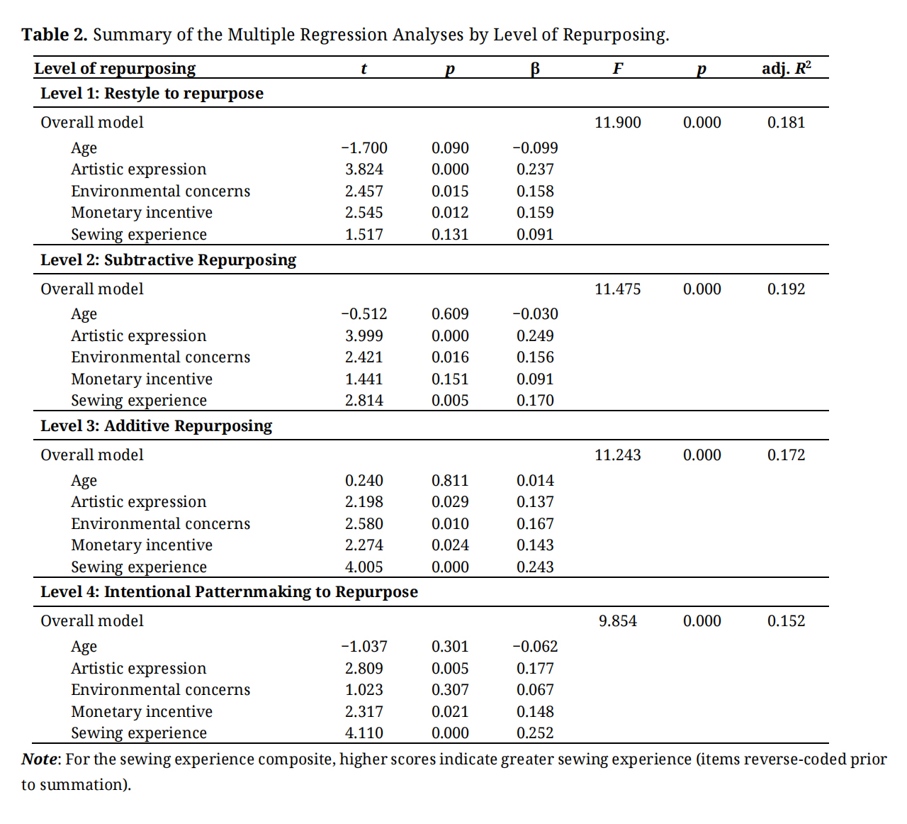 Multiple regression analyses were conducted to examine the relationship between sewing experience, artistic expression, environmental concerns, monetary incentive, and age on the frequency of repurposing applications across four levels of repurposing to support (or not support) the stated hypotheses. Analyses were performed using SPSS Statistics 27.0. Table 2 presents the results of the regression models by repurposing level.