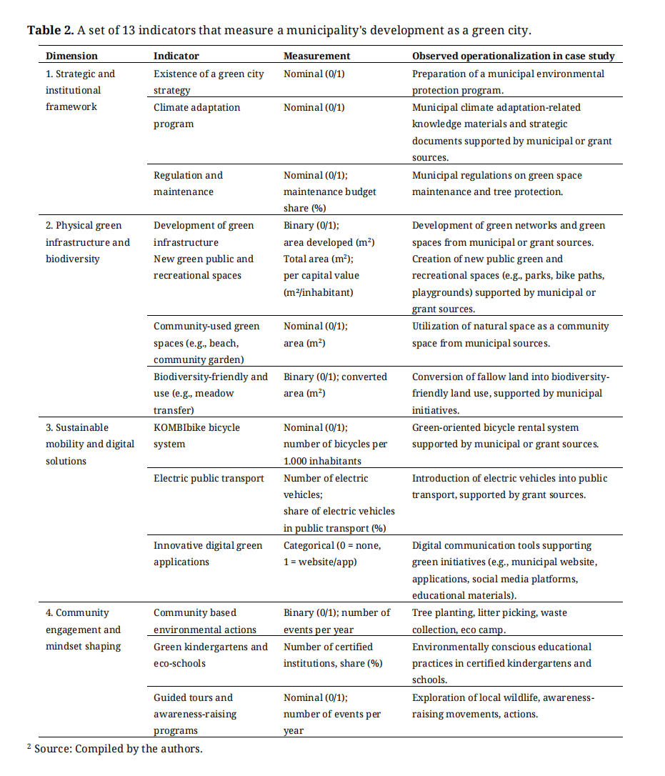 Against this backdrop, the present study examines whether green urban development can be operationalized in smaller, resource-constrained cities. Combining a systematic literature review with a detailed case study of Komárom, Hungary, the research aims to develop an indicator-based framework for assessing green urban development in small cities, evaluate its applicability across diverse geographical and economic contexts, and explore how green urban initiatives relate to perceptions of urban image in the case of Komárom.