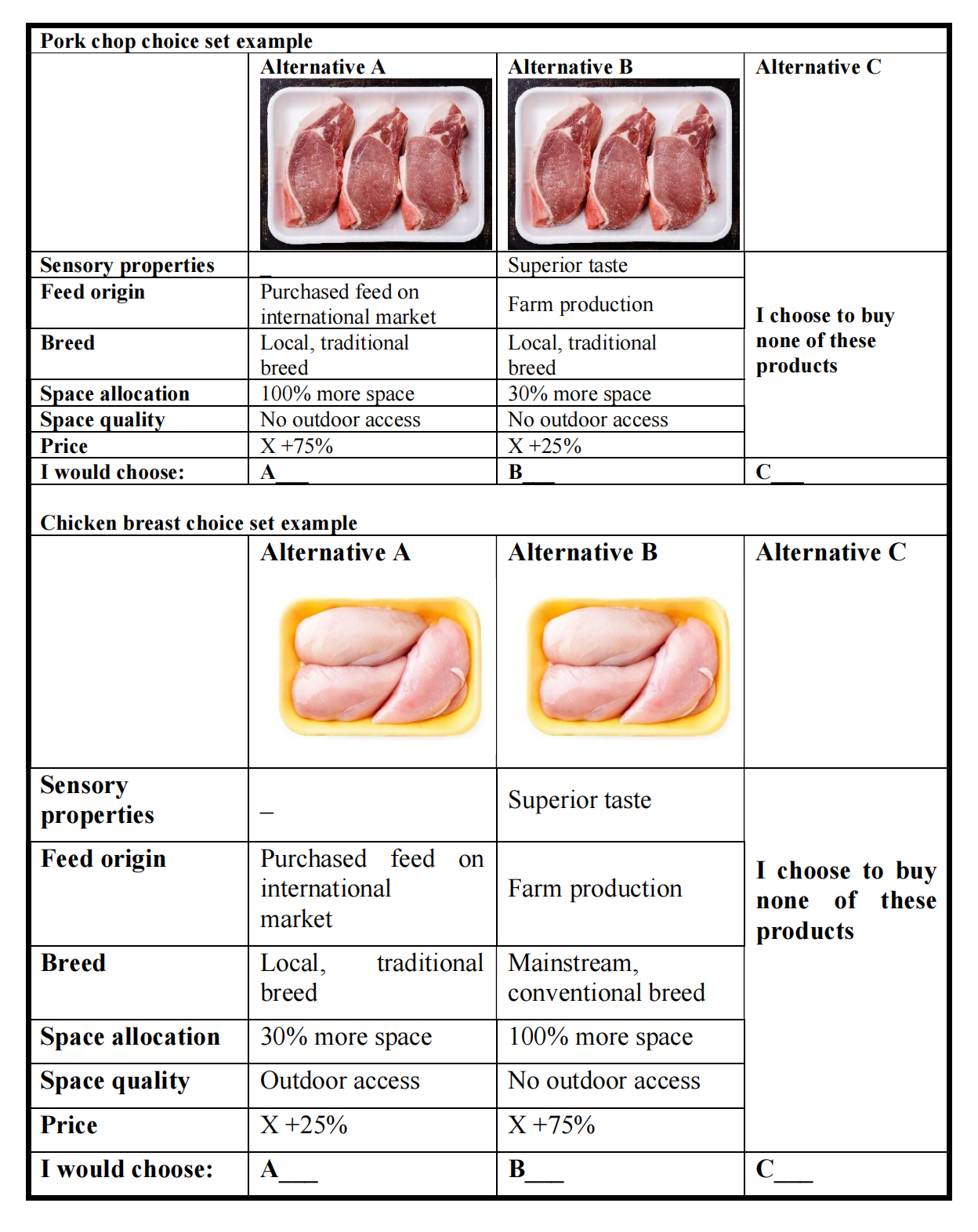 Figure 2. Examples choice sets for both product categories. Note. Participants were instructed to imagine they were purchasing the pork chops/chicken breast that they usually buy in a store. They could choose Alternative A, B or C. Source: Peschel et al. [20].