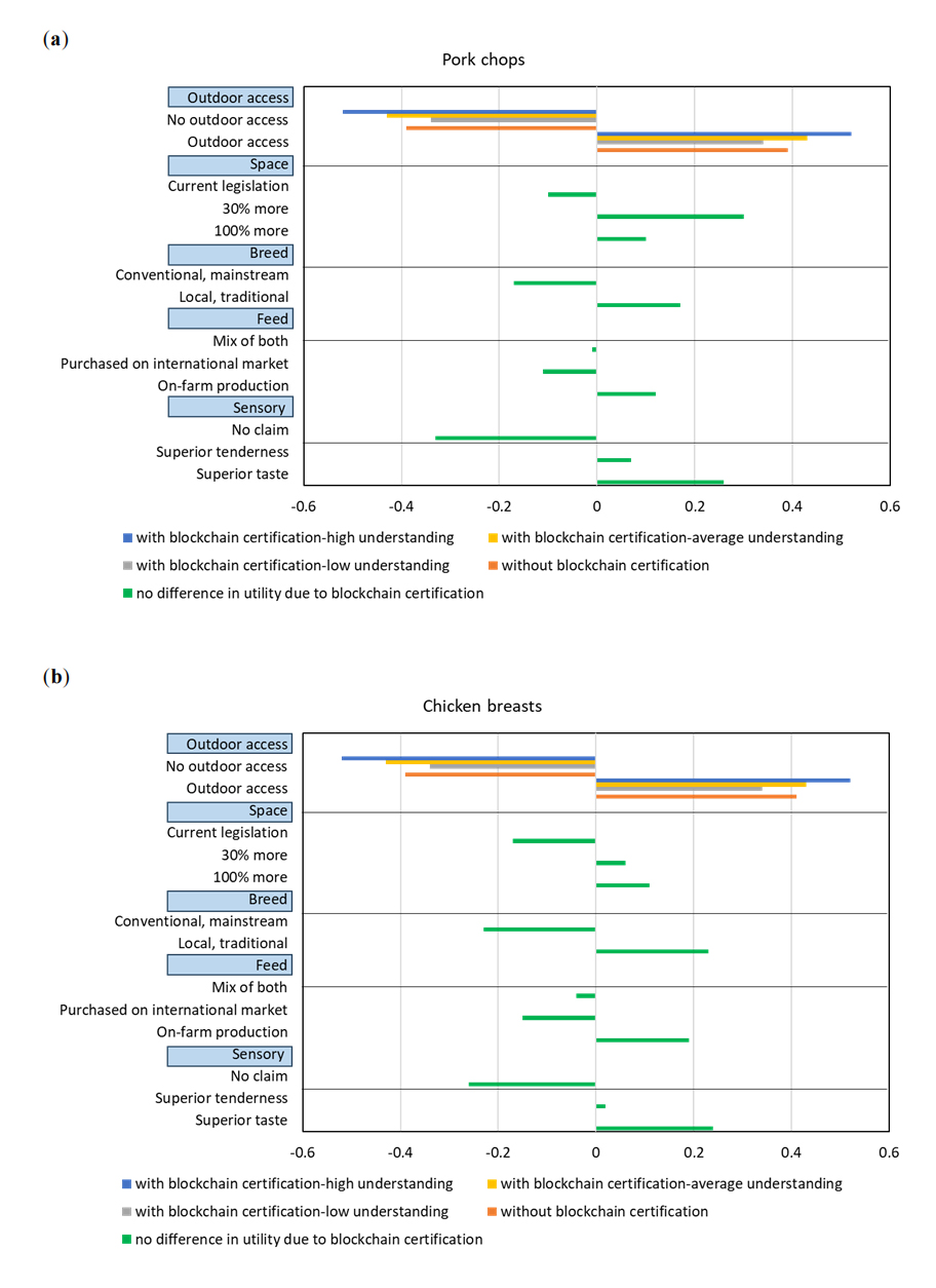 We investigate how blockchain verification affects consumer decision-making for pork chops and chicken breasts, two products that are increasingly marketed based on credence characteristics related to animal welfare and sustainability. When or to the extent that these attributes are important for consumers, the information that the information is blockchain verified can increase consumer confidence in this information such that it plays a bigger role in decision-making. While this presupposes some reasoned approach to decision-making, it is known that labelling information also can affect consumer decision-making in a more peripheral way. If the information that blockchain certification has been applied is processed in a peripheral way, this can increase consumer value perception even when the valuation of the product attributes remains unchanged. In our study we found some evidence on both of these effects. The attribute outdoor access, the for participants most important of the credence attributes, is assigned more utility in the decision by consumers when the information is claimed to be blockchain certified, and this effect is dependent on consumer understanding of the concept of blockchain such that the utility of outdoor access becomes higher the higher the understanding. The disutility of a price differential compared to standard product becomes smaller when the product is labelled as blockchain certified, and this effect becomes smaller with increasing understanding of the concept of blockchain—indicating that a higher understanding of blockchain makes peripheral processing less likely.