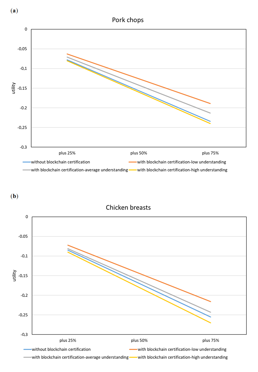The results for the price attribute can be seen in Figure 4. Also here, the interaction of blockchain verification and blockchain understanding is significant for both products (Wald = 10.04, p = 0.001 for pork chops, Wald = 17.66, p < 0.001 for chicken breasts), such that the disutility of price is higher when no blockchain certification is present, confirming H4. The main effects of blockchain verification were not significant (for pork chops Wald = 3.22, p = 0.07; for chicken breasts Wald = 2.11, p = 0.15). As can be seen in Figure 4, the blockchain certification decreases the disutility of the price differentials, and this effect was smaller for higher levels of understanding of blockchain. As can be seen, the price disutility at the highest level of blockchain understanding is almost identical with the non-blockchain condition.