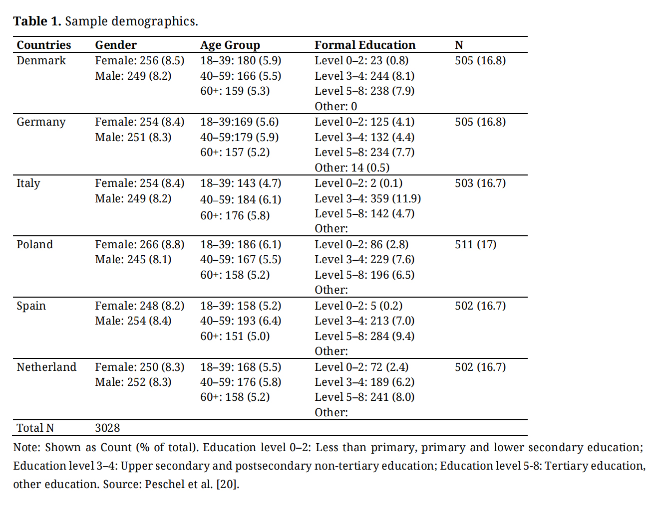 Sample and Data CollectionThe sample was collected by the market research agency Norstat (https://norstat.dk/). The target was to collect data in Denmark, Germany, Italy, Poland, Spain and the Netherlands from representative samples of 500 consumers each. The samples were representative in terms of the national level of formal education, age and gender, resulting in an overall sample of 3028 European consumers. Respondents had to eat at least pork or chicken, and respondents who did not normally eat both types of meat answered only that part of the questionnaire that pertained to the meat they eat.