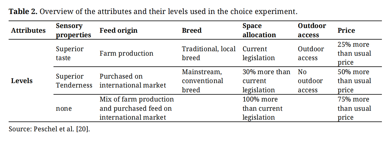 Participants in our study made choices between two pork chops or chicken breast alternatives (3 pieces, 600 g). They were instructed to imagine making a choice in their regular supermarket. They could opt out of choice through a ‘none-of-these’ alternative. Each participant made 9 choices per meat category in a randomized order. Those participants who indicated that they only consumed pork or only broiler meat in their everyday life received only choice sets for this meat product category. The experimental design of the choice sets was generated as a D-optimal random parameter panel design using Ngene software [23]. The experimental design consisted of 36 choice sets (For chicken, only 35 different choice sets were used due to an error during survey set-up.) with four blocks. The D-error of the final design was 0.26. The attribute levels were combined differently across the choice alternatives based on the experimental design. The list of attributes and levels is displayed in Table 1. Attribute selection was based on a literature review and expert interviews following standard procedures in the field to account for the most important aspects in consumers’ decision-making process [24,25]. The attributes used were sensory properties, feed origin, breed, space allocation, outdoor access and price (see Table 2). Feed origin, breed, space allocation and outdoor access are all credence attributes.