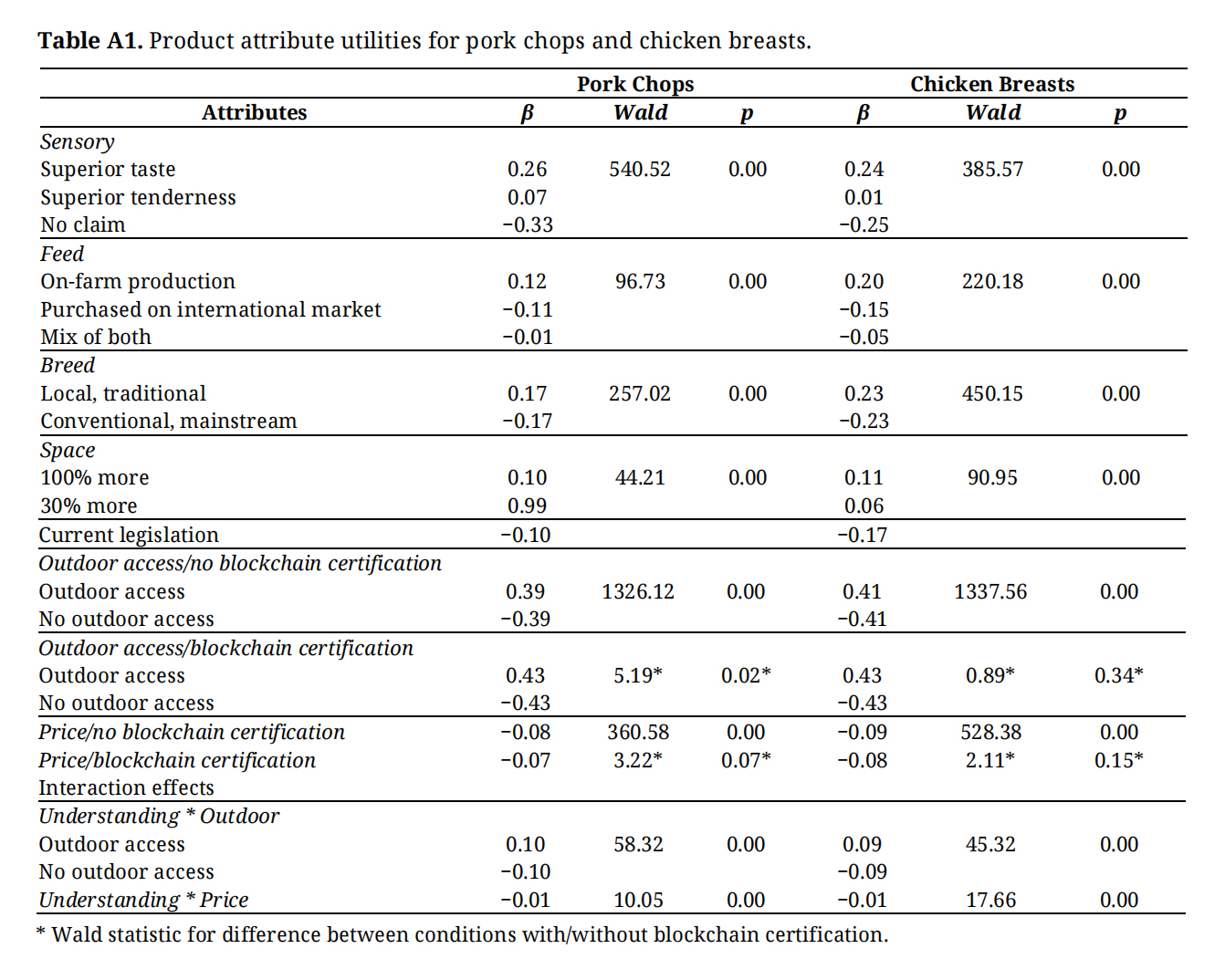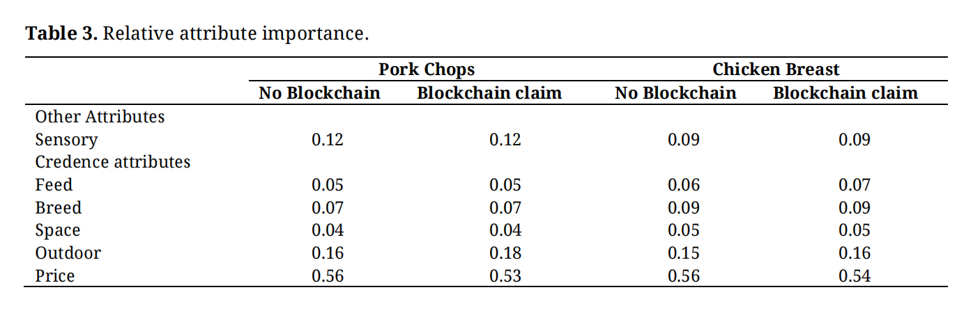 From Table 3 we can conclude that price is relatively less important in the decision-making process when blockchain verification is communicated to consumers. Instead, the outdoor access attribute gains in importance for both meat types. This is also the most important of the credence attributes.