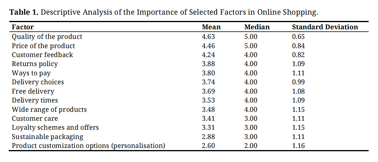 The findings suggest that consumers value most highly product quality, product price, and customer reviews when navigating online purchasing decisions. Factors such as sustainability and personalisation, however, appear to play a negligible role in determining choice. Furthermore, in terms of response variation, the item ‘personalisation’ registered the highest dispersion (highest SD), whereas the data for ‘product quality’ showed minimal variability, indicating strong agreement among the respondent cohort on its essential importance.