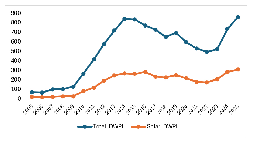 Patenting activity remained relatively modest from 2005 to 2009, gradually increasing from 70 patent families in 2005 to 127 in 2009, reflecting a slow growth phase. Between 2010 and 2014, however, the sector entered a period of rapid expansion. The number of patent families surged from 265 to 841, indicating a substantial acceleration in innovation intensity and technological development during this stage. Following this peak, patent output remained at a relatively high level but began to fluctuate. Between 2015 and 2018, the number of patent publications declined moderately from 834 to 652. A slight rebound was observed in 2019 (693), followed by another downturn between 2020 and 2022, reaching a recent low of 494 patent families in 2022. Figure 2 illustrates the patent publication trends measured by the number of DWPI patent families and the solar energy–related patent applications from 2005 to 2025.
