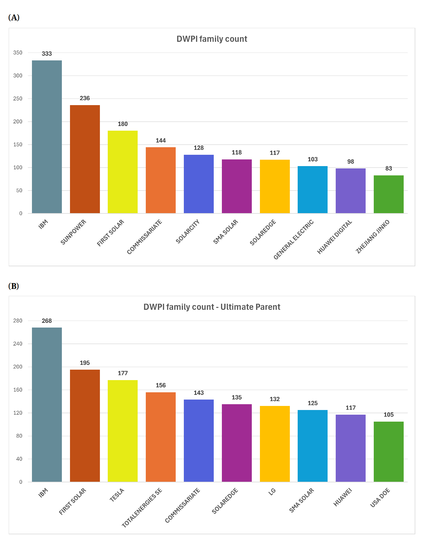 Figure 3. (A) Top green energy patent assignees; (B) Ultimate parents of the assignees.