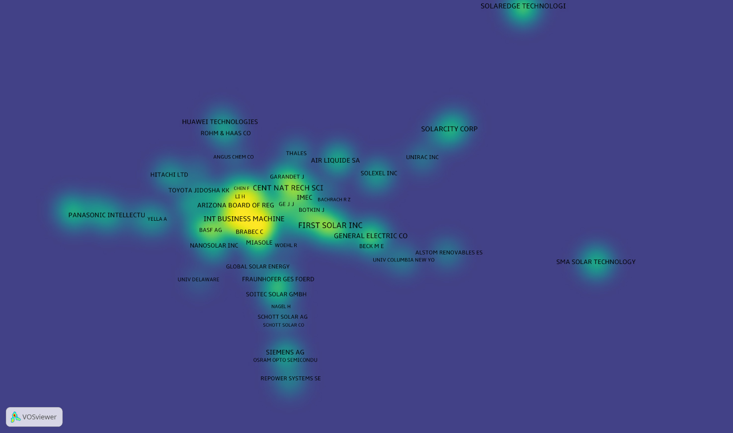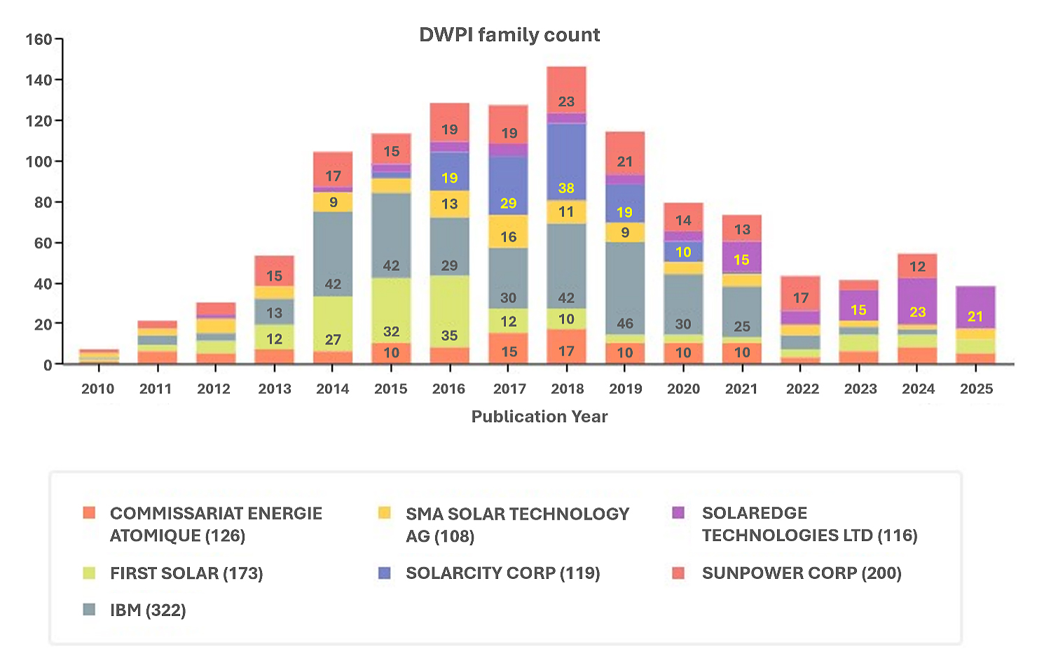 Figure 4 reveals a highly concentrated and temporally uneven competitive landscape. Earlier leaders, including IBM, First Solar, and SolarCity, peaked around 2018, after which their patenting intensity declined markedly. Several previously dominant firms have since reduced activity substantially or exited sustained innovation efforts altogether.