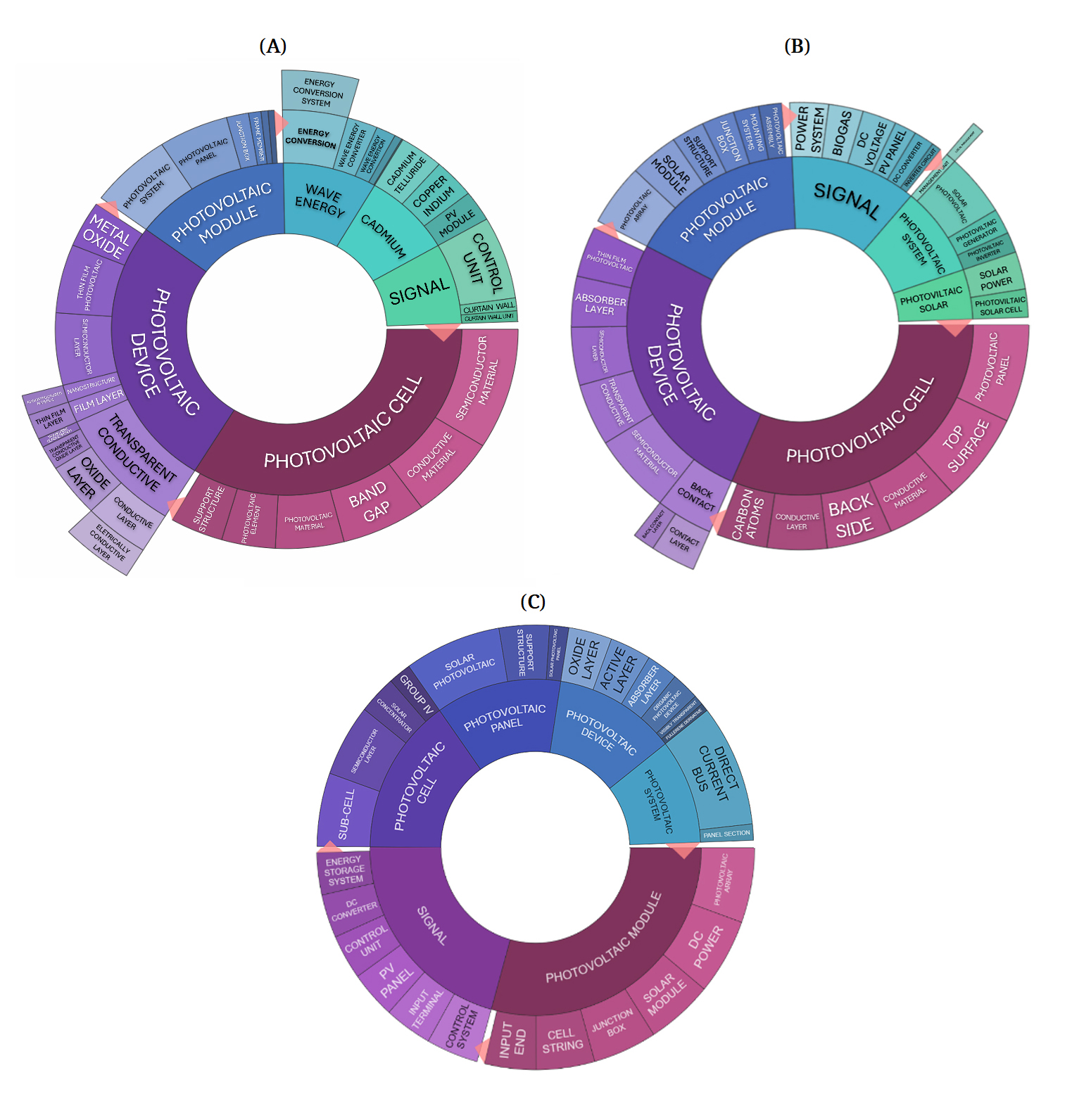 Figure 6C reveals further structural concentration coupled with deeper integration. The category layer dominates the landscape, while the substrate expanded substantially, reflecting the intensification of multilayer photovoltaic device architectures, particularly perovskite-based systems. Concurrently, intelligent control technologies, including switches and strings, have gained prominence, indicating the deepening of system-level optimisation. Perovskite emerged explicitly as a distinct topic, confirming the rise of next-generation photovoltaic materials. During this phase, the overall technological trajectory is firmly centered on high-efficiency solar materials and intelligent power management systems.