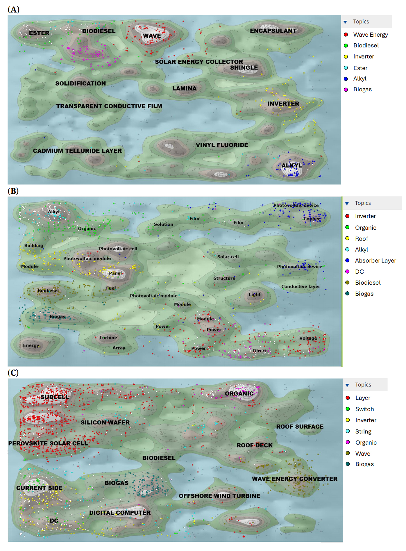 Figure 5. Green energy patent clusters: (A) 2005–2012; (B) 2013–2017; (C) 2018–2025.