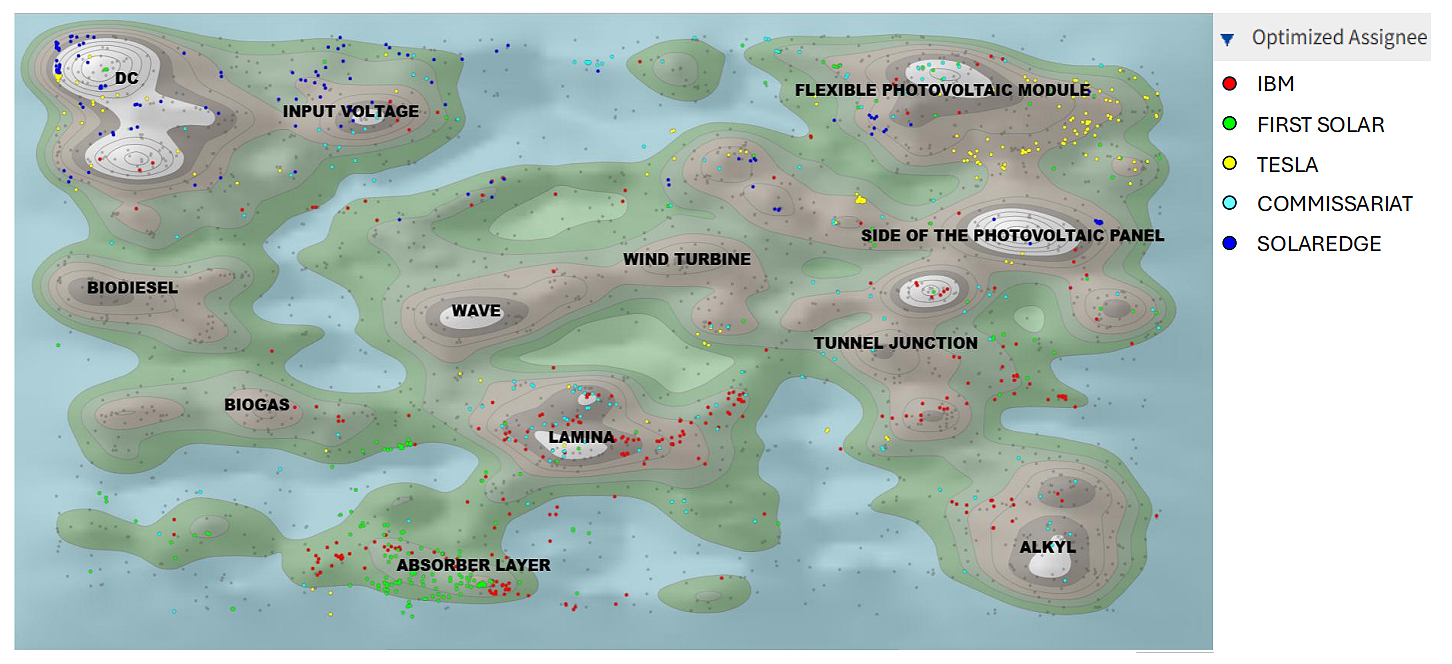 Figure 5B indicates a pronounced shift toward solar photovoltaic technologies and system integration. Inverter-related topics have risen sharply and become the dominant cluster, accompanied by growth in organic materials and building-integrated applications. The core photovoltaic device components expand concurrently. In contrast, biofuel and marine energy themes decline in prominence. The distribution indicates the consolidation of innovation activity around solar-based technological architectures. This pattern reflects the rapid expansion of assignees specialising in these domains, including IBM and SolarCity.