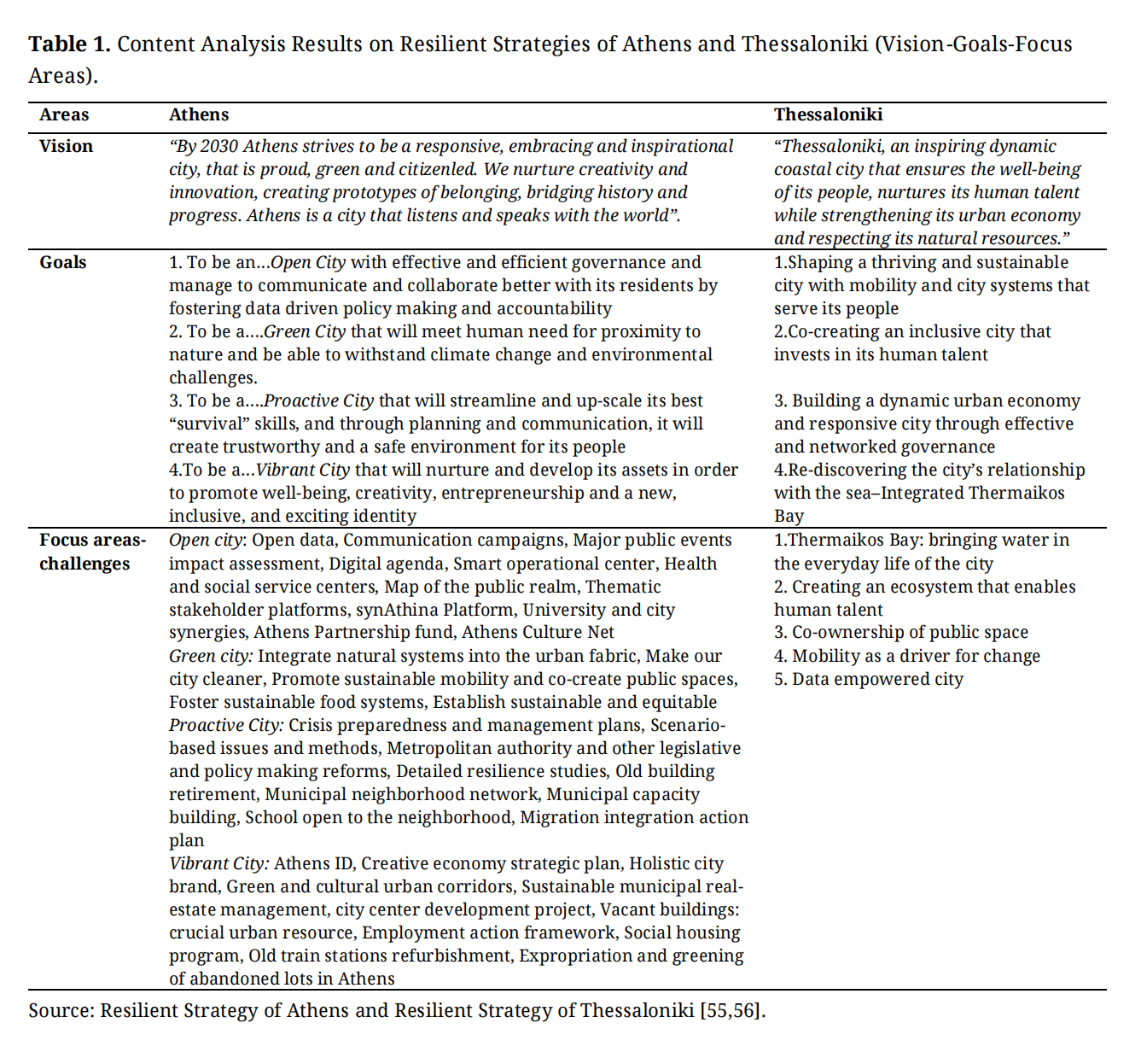 The content analysis of the resilience strategies 2030 for Athens and Thessaloniki was conducted based on three analytical dimensions, including the vision, the goals and the main challenges identified in each document. The first dimension that the two resilience strategies were examined was related to the vision of each city regarding its future development. In both strategies, citizens and creativity are the core of their urban transformation narrative. This perspective reflects an understanding of resilience as a cultural and social construct and not as a solely technical or environmental process.