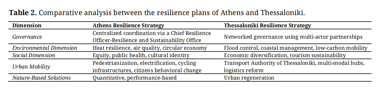 Urban resilience and urban sustainability have been extensively examined in the literature, as both concepts focus on the capacity of urban areas to respond and adapt to crises such as climate change, natural disasters and socioeconomic pressures. The present study examines two resilience strategic plans developed for two major cities within the framework of the global 100 Resilient Cities (100RC) Network. By applying a quantitative methodological approach, using comparative analysis, the study aims to identify differences across five main dimensions of the cities’ resilience plans. Specifically, the governance, environmental, social, urban mobility and nature-based solutions perspectives are examined in both plans.