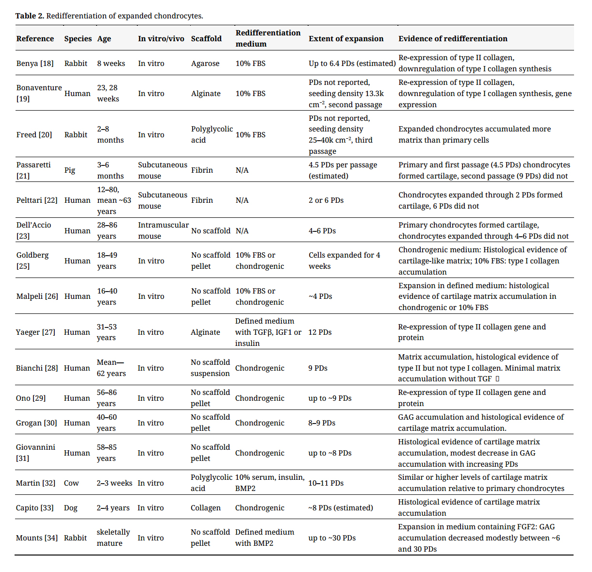 For studies evaluating chondrocyte expansion and redifferentiation, the extent to which chondrocytes have been expanded appears to be largely arbitrary, with few studies targeting expansion needs for specific tissue engineering therapies. Therefore, the primary objective of this review is to characterize chondrocyte expansion for selected approaches to cartilage tissue engineering so that the steps needed to induce redifferentiation can be identified. Expansion for the use of autologous chondrocytes to treat focal cartilage defects or joint resurfacing was calculated in terms of cumulative population doublings (PDs), which is the number of times a starting population of cells must double to reach a target cell number. Across the studies referenced for this review there is a moderate amount of variability in the methods used to promote expansion and redifferentiation. Therefore, we identified techniques that are particular effective in promoting expansion and/or redifferentiation.